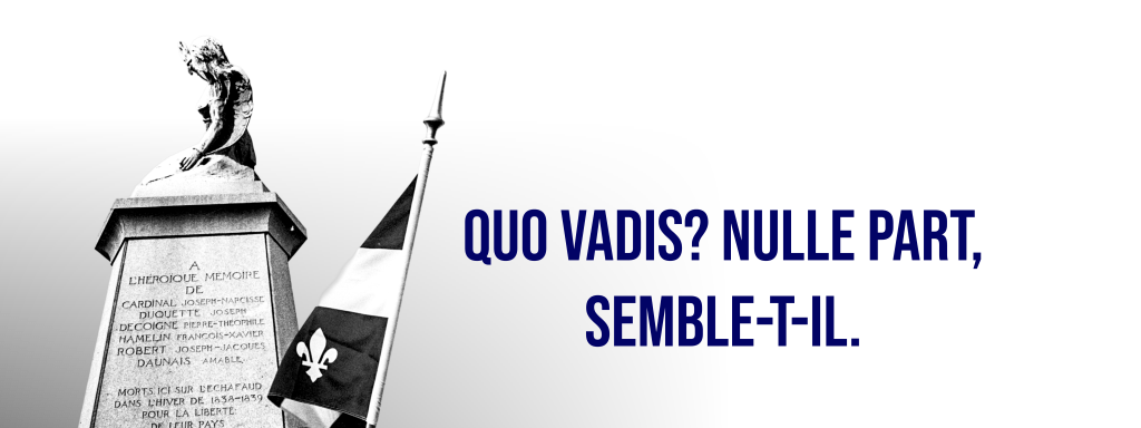 Le peuple du Québec aura traversé, depuis la Conquête, des phases successives d’insoumission, allant de la rébellion à la survivance en passant par l’autonomisme et l’émancipation. Nous nous inscrivons dans la longue lignée de ceux qui ont sans concession soudé leur engagement à la question nationale dans une optique de libération. Mais l’époque étant ce qu’elle est, nous ne pouvons pas simplement reprendre les combats d’hier en faisant comme si nous étions encore et toujours dans une situation identique. Car si les dynamiques agissent sur les mêmes ressorts, il n’en reste pas moins que le temps passé depuis les dernières luttes sérieuses en matière identitaire a dangereusement usé notre cohésion. Nous sommes dorénavant en posture affaiblie. La langue est en déclin accéléré alors que notre métropole nous échappe, l’américanisation des consciences prend une ampleur désastreuse, l’immigration massive change drastiquement le paysage démographique, le consumérisme et l’individualisme atomisent la société et, pendant ce temps, la centralisation ottavienne en profite pour aiguiser ses dents.